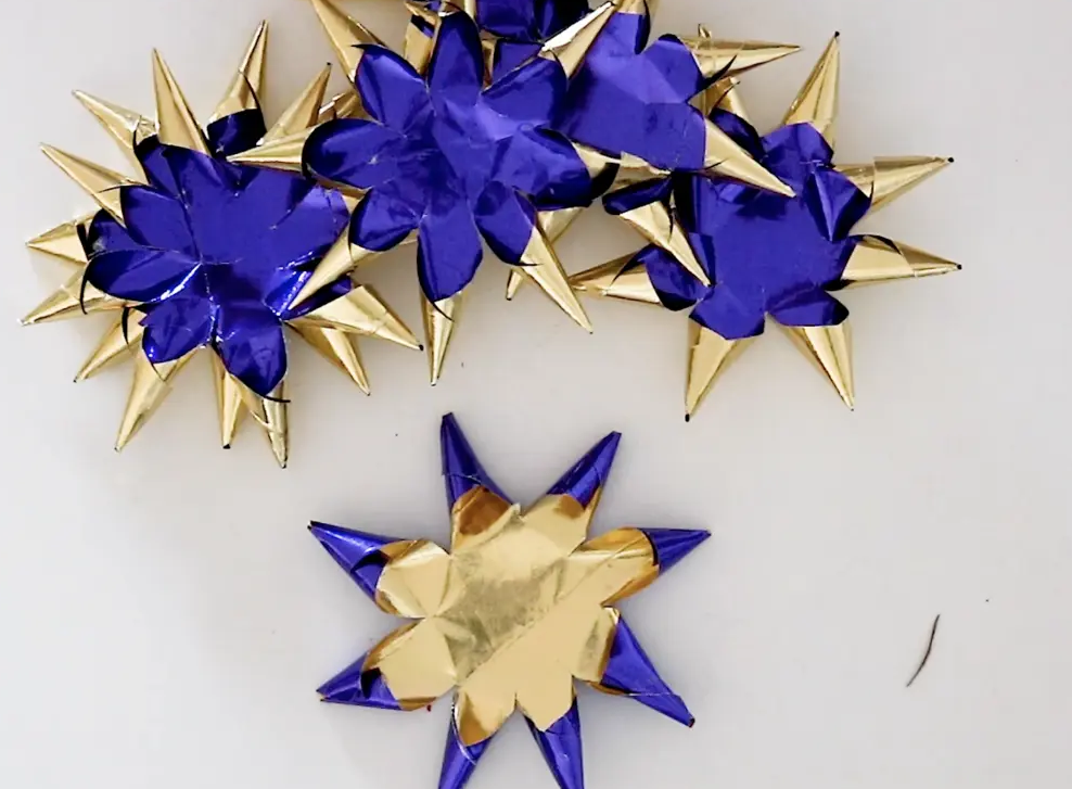 Now make several of these stars. For a full star you need about 10-12 individual star elements. You can vary here, e.g. turn purple or gold-coloured points, depending on how you lay the gold foil.