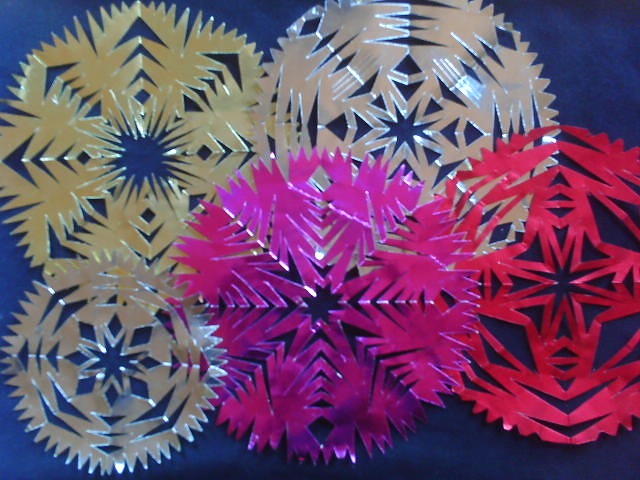 Maak nu verschillende van deze sterren. Voor een volledige ster heb je ongeveer 10-12 afzonderlijke sterelementen nodig. Je kunt hier variëren, b.v. paarse of goudkleurige punten maken, afhankelijk van hoe je de goudfolie legt.